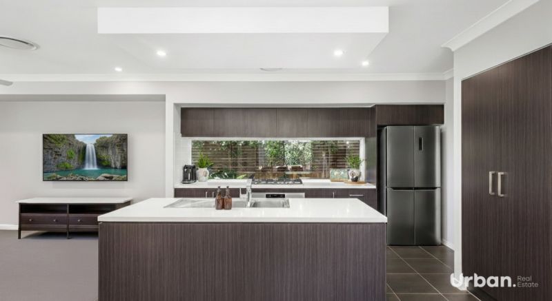 - Stylish kitchen featuring 40mm stone benchtops, 900mm appliances, and plumbing provision behind the fridge.
