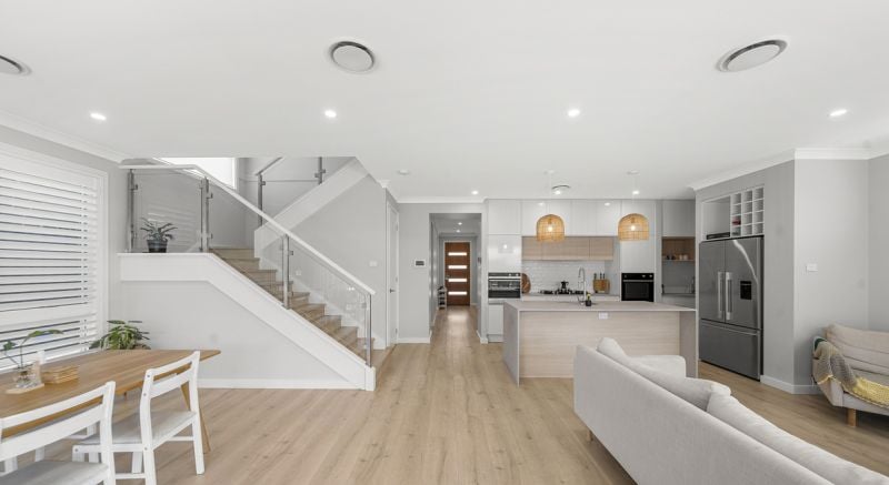 Finished in a beautiful Scandinavian inspired theme the house is light & bright & boasts lots of space - Stepping in you have wide hall ways teamed with high ceilings, The sought after separate media room positioned right at the front with gorgeous timber floorboards rolling into the main living & kitchen space and then out on to the full width feature alfresco effortlessly !