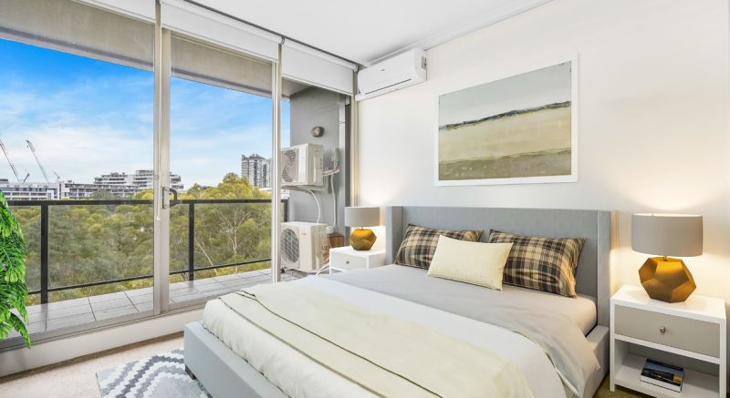 - Both bedrooms open directly onto a full-length balcony with stunning city and treetop views