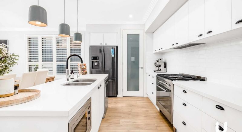 High ceilings add an extra dimension of space, and the inclusions in the kitchen such as 40mm ceaser stone bench tops, white butchers brock splash & soft close cabinetry.