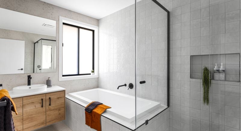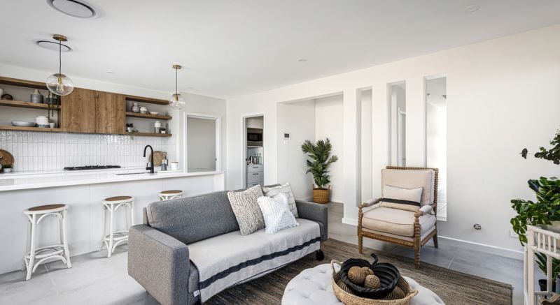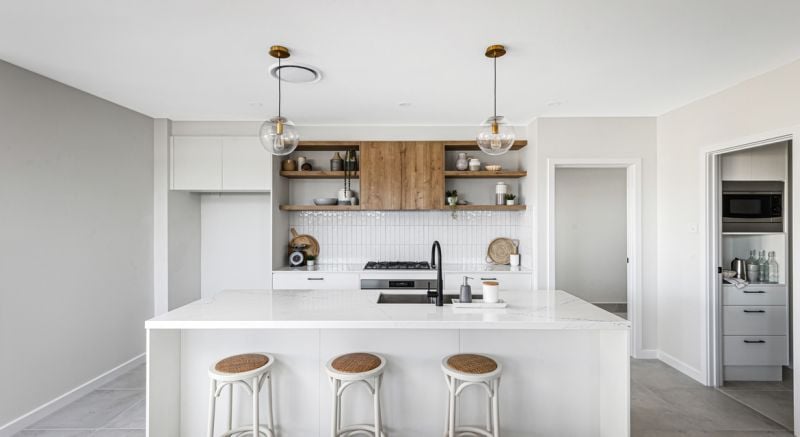 - Premium kitchen finishes, feature open shelving, double bowl undermount kitchen sink, pull-down sink mixer, 40mm stone to Island, pull out bins, pot drawers, microwave tower space