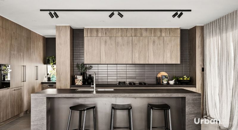 Light grey-gum timber finished two tone cabinetry in the kitchen and bathrooms with concrete look tiles and dark stone features blend well and flow throughout the home.