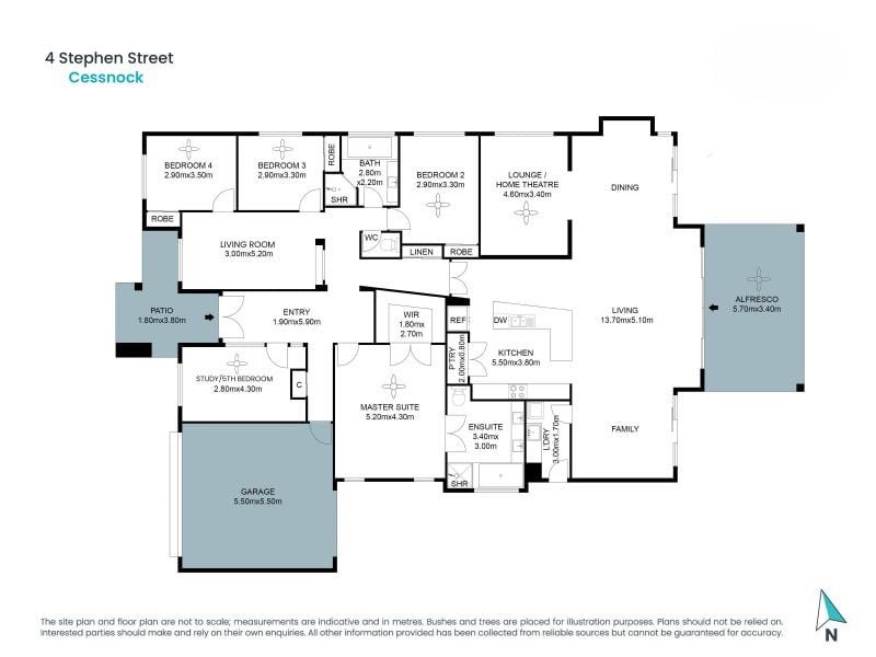 - Five beautiful bedrooms including a king-sized master with walk-in robe and luxury ensuite with double vanity, stone benches and oversize bath. All boasting walk/built-in robes