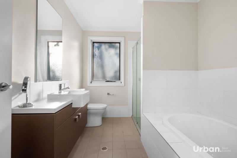 The spacious secondary bedrooms are fitted with built-in robes and large windows that flood the rooms with natural light. The main bathroom is equally well-appointed, with a bath, modern tiling, and stylish vanities. The property benefits from direct garage access from the street, not the laneway, adding to its convenience. The backyard offers a spacious outdoor area, complete with side access, perfect for families looking for space and privacy.