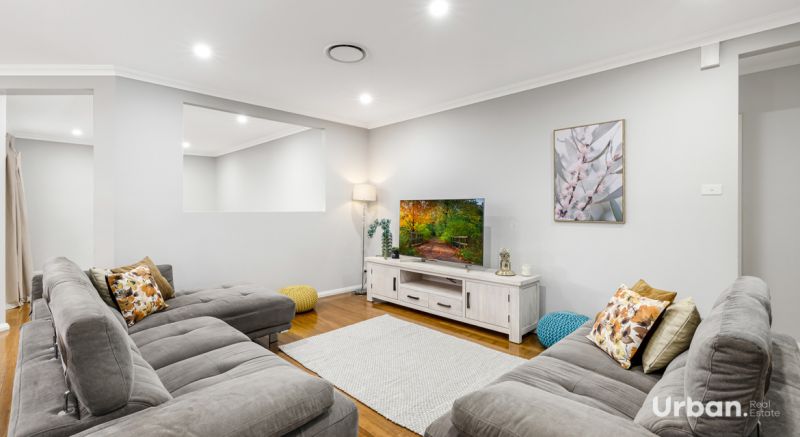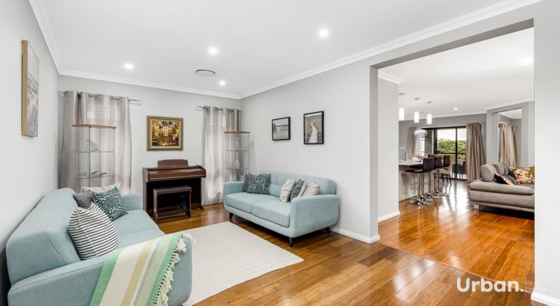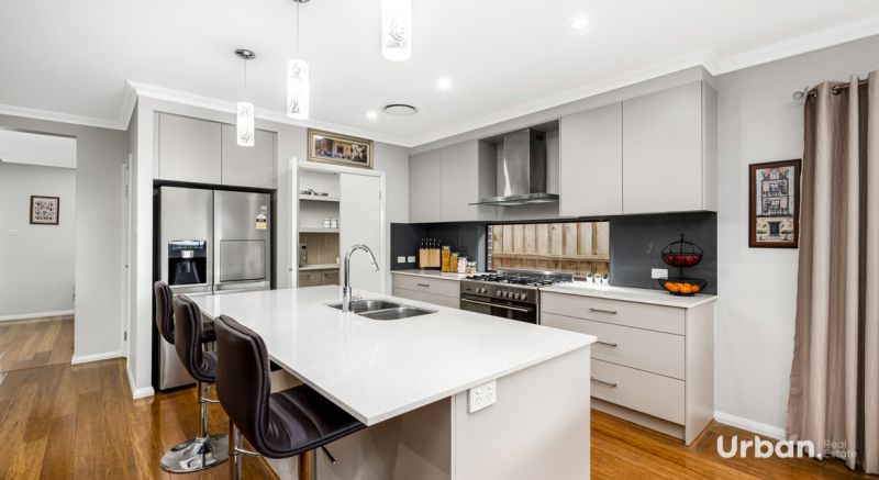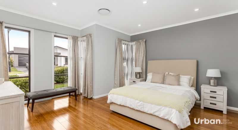 Nestled in the heart of Colebee's most sought after estate, Stonecutters Ridge, this Eden Brae built home is a testament to luxury and comfort. As you step inside, be greeted by the warmth of bamboo floorboards and the open expanse of high ceilings, creating a sense of modern elegance throughout. Large windows throughout adorn the property with natural light, complemented by a captivating chandelier at the entry, setting the tone for a home that balances style and functionality seamlessly.
