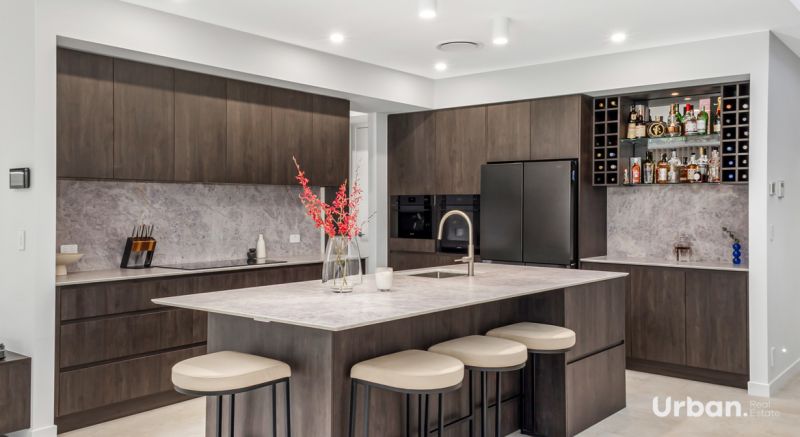 Nestled in front of picturesque bushlands, this Buildcraft Construction exudes grandeur from the moment you arrive. The timeless façade, stone feature wall and custom made timber entry door make a bold statement, setting the tone for the exceptional craftsmanship within.