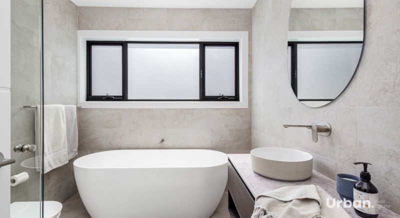 Step inside to discover high ceilings, French pattern tiles, and an abundance of natural light that dances through large windows, creating an inviting atmosphere throughout the three spacious living areas. The kitchen is a chef's dream, featuring a beveled edge stone bench top, a built-in breakfast bench and bar, and a matching splash back in both the kitchen and laundry.