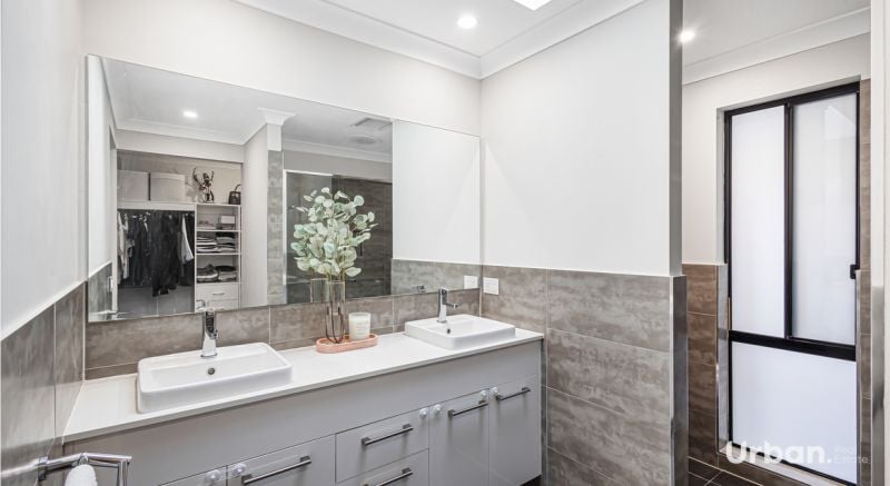 -Enormous master suite featuring a walk-in robe, ensuite with double basins, and plantation shutters.