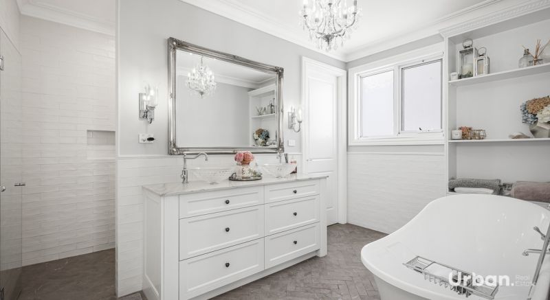 The master suite is a true retreat, complete with its own lounge, Hollywood-style dressing room, and a lavish ensuite featuring marble finishes, glass vanities, a freestanding bath, and step-in shower. Three additional upstairs bedrooms each feature walk-in robes with custom cabinetry, while bathrooms throughout showcase herringbone tiling, ornate mirrors, frameless screens, and marble vanities.