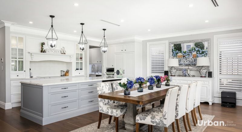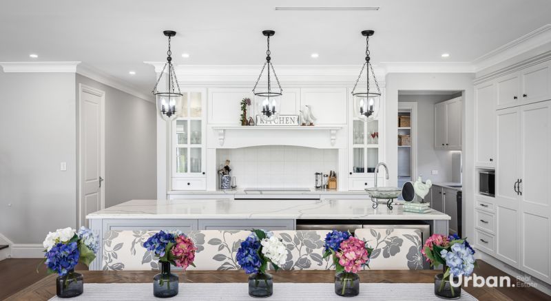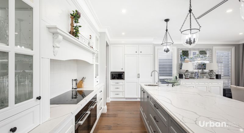The sensational kitchen is a true showpiece, showcasing marble benchtops, French provincial cabinetry, and a suite of premium Miele appliances including dual ovens, induction cooktop, integrated fridge/freezer, and dishwasher. A butler's pantry with Zip HydroTap and additional cabinetry ensures both practicality and grandeur, complemented by dual Vintec wine fridges for effortless entertaining.