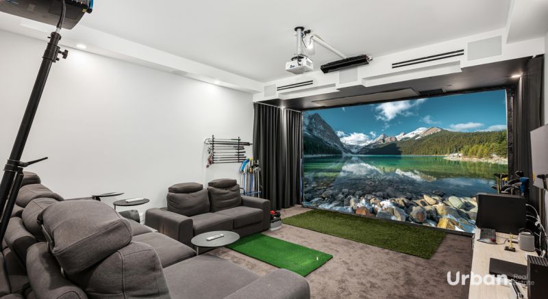 For the ultimate entertainment, the fully equipped media room doubles as a golf simulator, complete with Uneekor launch monitor, high-end PC, dual BenQ projectors, Paradigm sound system, and a dedicated server rack with Yamaha receiver and Unifi home network system.