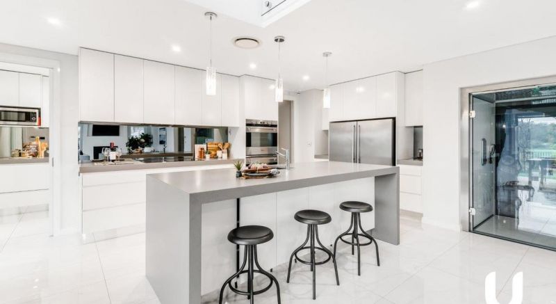 - Chic stone kitchen with butler's pantry, walk in pantry, mirrored splash back and high end finishes