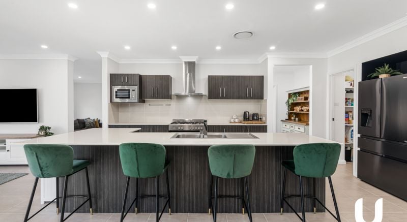 - Kitchen featuring tiled splash back, breakfast bench, modern cabinetry, walk in pantry and butlers pantry