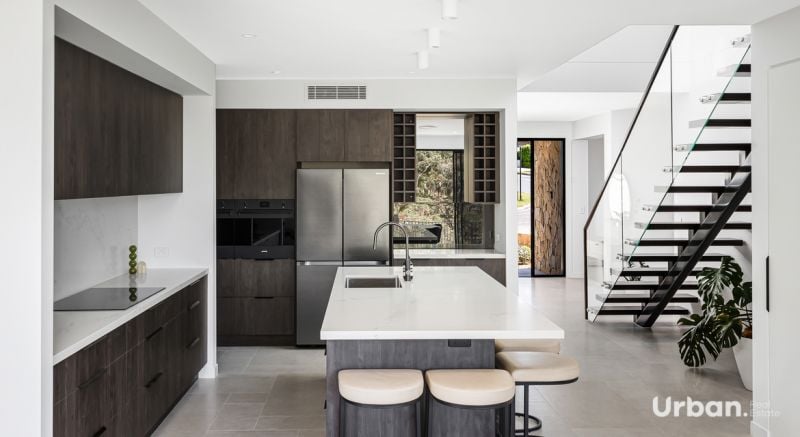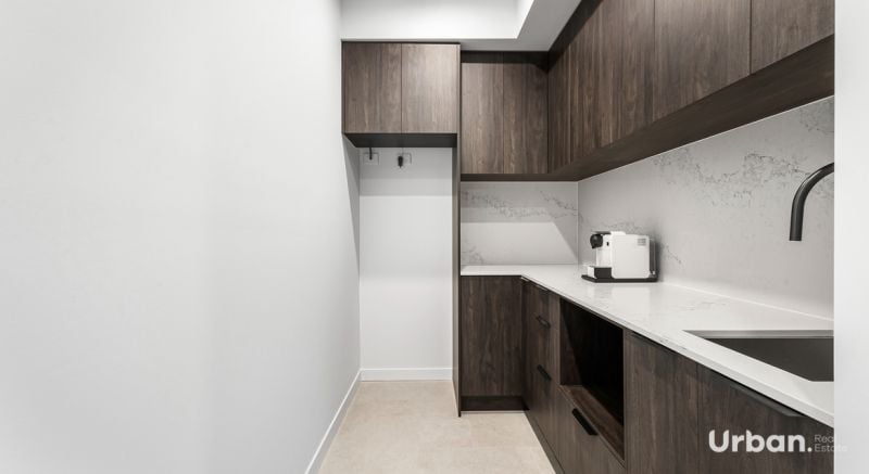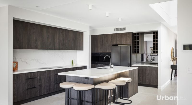 - Stylish kitchen featuring 40mm stone benchtop, built-in breakfast bench, butler's pantry and bar, and matching splashbacks in both kitchen and laundry