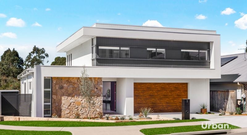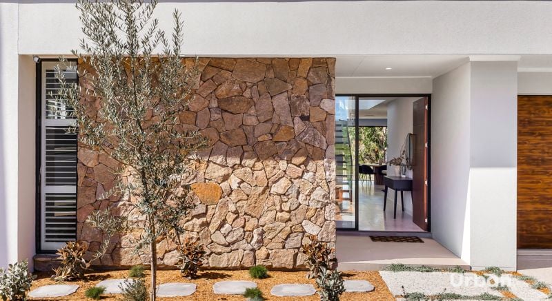 - Distinctive features include a stone feature wall, wide timber front door, and a custom timber staircase with glass balustrade