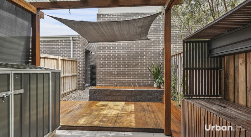 - North-facing alfresco with extended decking and built-in shed