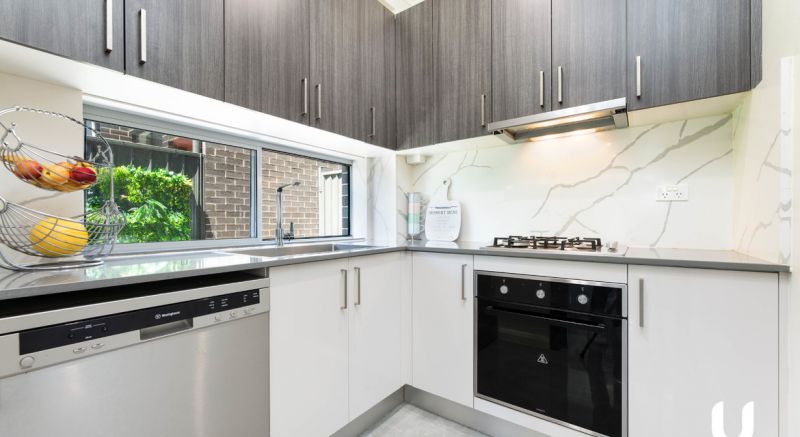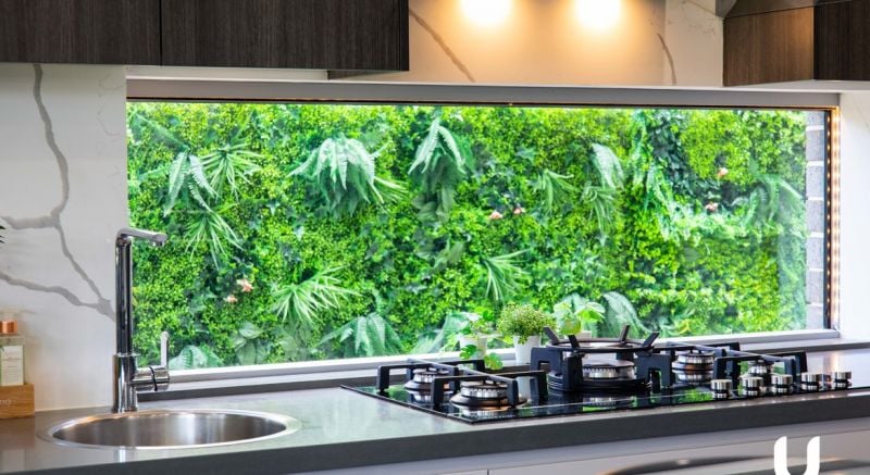 - The modern kitchen also features a sleek splashback glass window