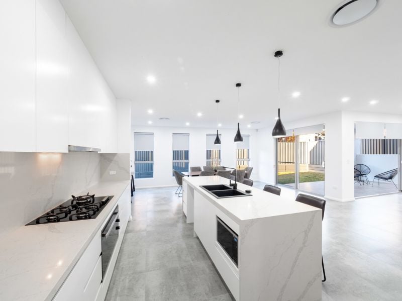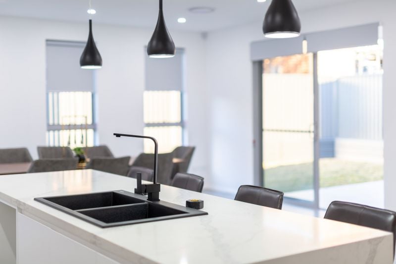 - Deluxe kitchen with 40mm Calcutta benchtop island and Oliveri Santorini double granite sink