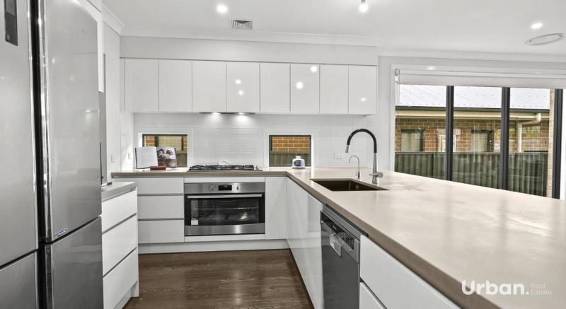 - 40mm kitchen benchtop with an integrated dishwasher, oven, and gas cooktop