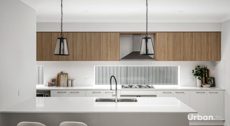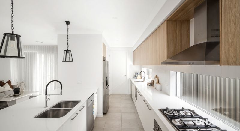 Facing the reserve on Caledonia, this elegant residence exudes a palatial vibe like no other. From the moment you step through the extra wide entry, you will feel right at home. Soaring ceilings occupy the entrance which leads you down the hall to a downstairs guest bedroom and ensuite with dual access. To the right you will find an office or study space with a built in stone desk perfect for the work from home set up. The open plan kitchen living and dining space is perfectly proportioned for family living. The kitchen comprises of stone benchtops, 900mm appliances and open pantry with ample storage.