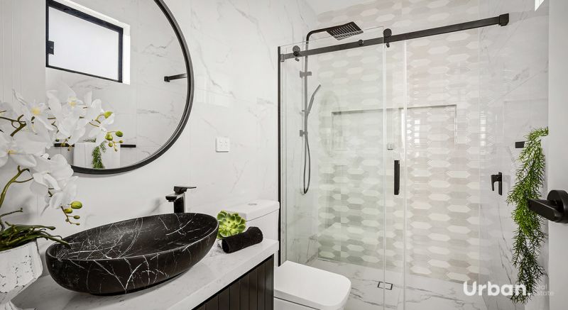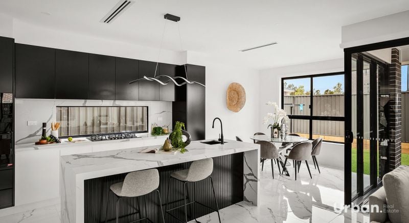 - A modern kitchen equipped with the latest appliances and a 40mm Caesarstone benchtop featuring a waterfall edge