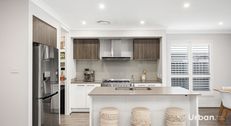 - Gourmet kitchen featuring: Stone benchtops with breakfast bar, Premium stainless-steel appliances, Custom wood-grain overhead cabinetry, Generous pantry storage, Modern rangehood