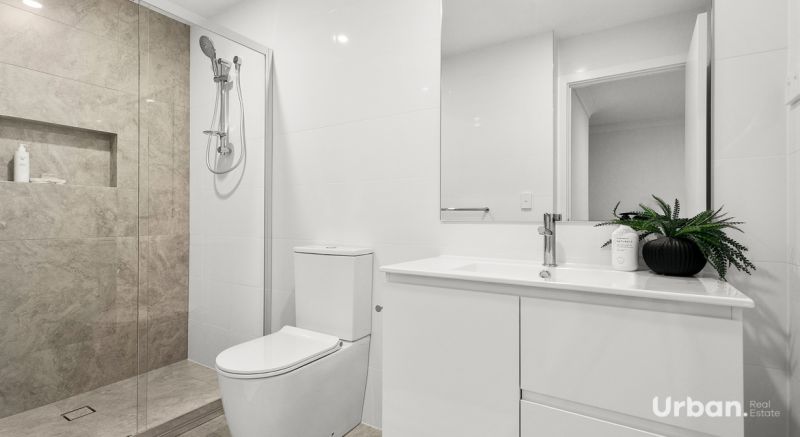 Upstairs, the luxurious master suite provides a peaceful retreat with a walk-in wardrobe and stylish ensuite, while two additional bedrooms with built-in robes and soft grey carpets share a beautifully appointed main bathroom featuring floor-to-ceiling tiles and modern fittings.