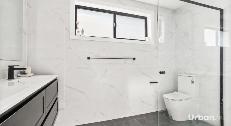 Step inside to be greeted by a spacious, light-filled interior, where a large window above floods the space with natural sunlight, creating a warm and inviting atmosphere. The master suite is a standout feature, boasting a luxurious ensuite with a his and hers vanity and a generous walk-in robe, providing a private retreat for relaxation.